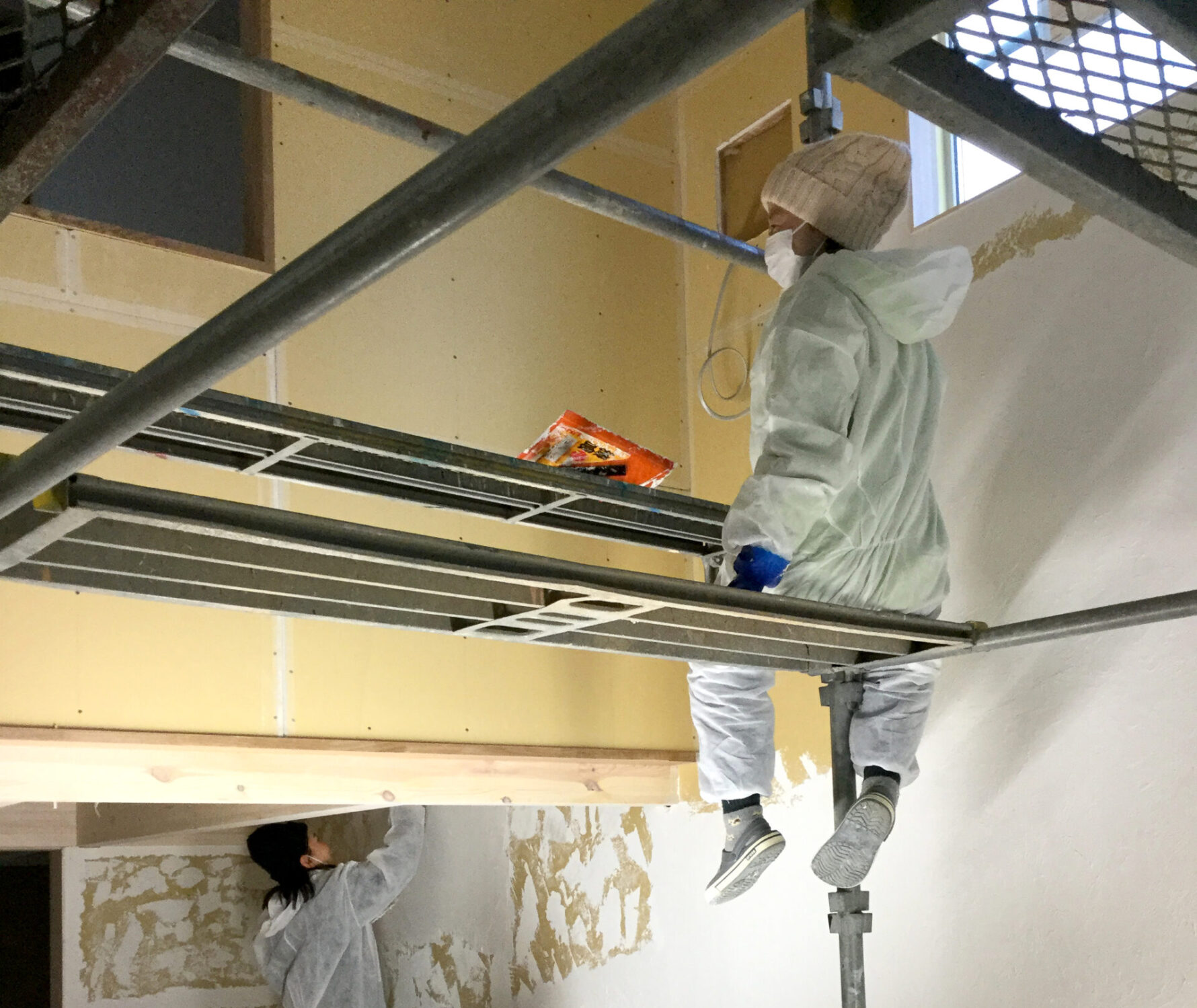 リビングの大壁は足場を組んでの本格的な施工に挑戦された中村様。